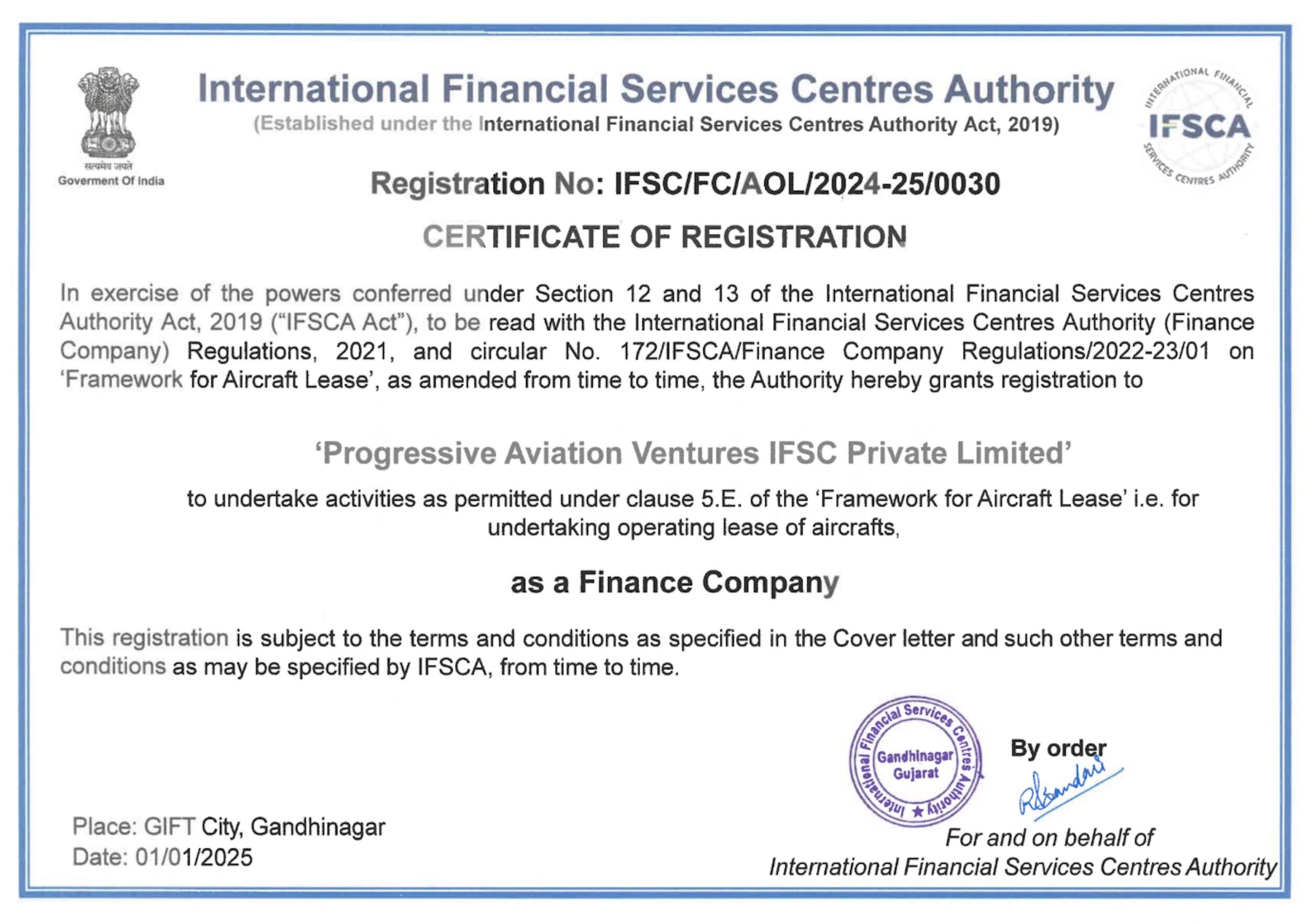 Progressive Aviation Ventures IFSC Private Limited is proudly registered as a Finance Company with the International Financial Services Centres Authority (IFSCA) and operates from GIFT IFSC,Gandhinagar, Gujarat. The Company undertakes permitted financial activities strictly in accordance with the provisions of the IFSCA Act, the IFSCA (Finance Company) Regulations, 2021, and the Framework for Aircraft Lease,as amended from time to time. Progressive Aviation Ventures IFSC Private Limited holds a valid Certificate of Registration (CoR) issued by the International Financial Services Centres Authority (IFSCA).